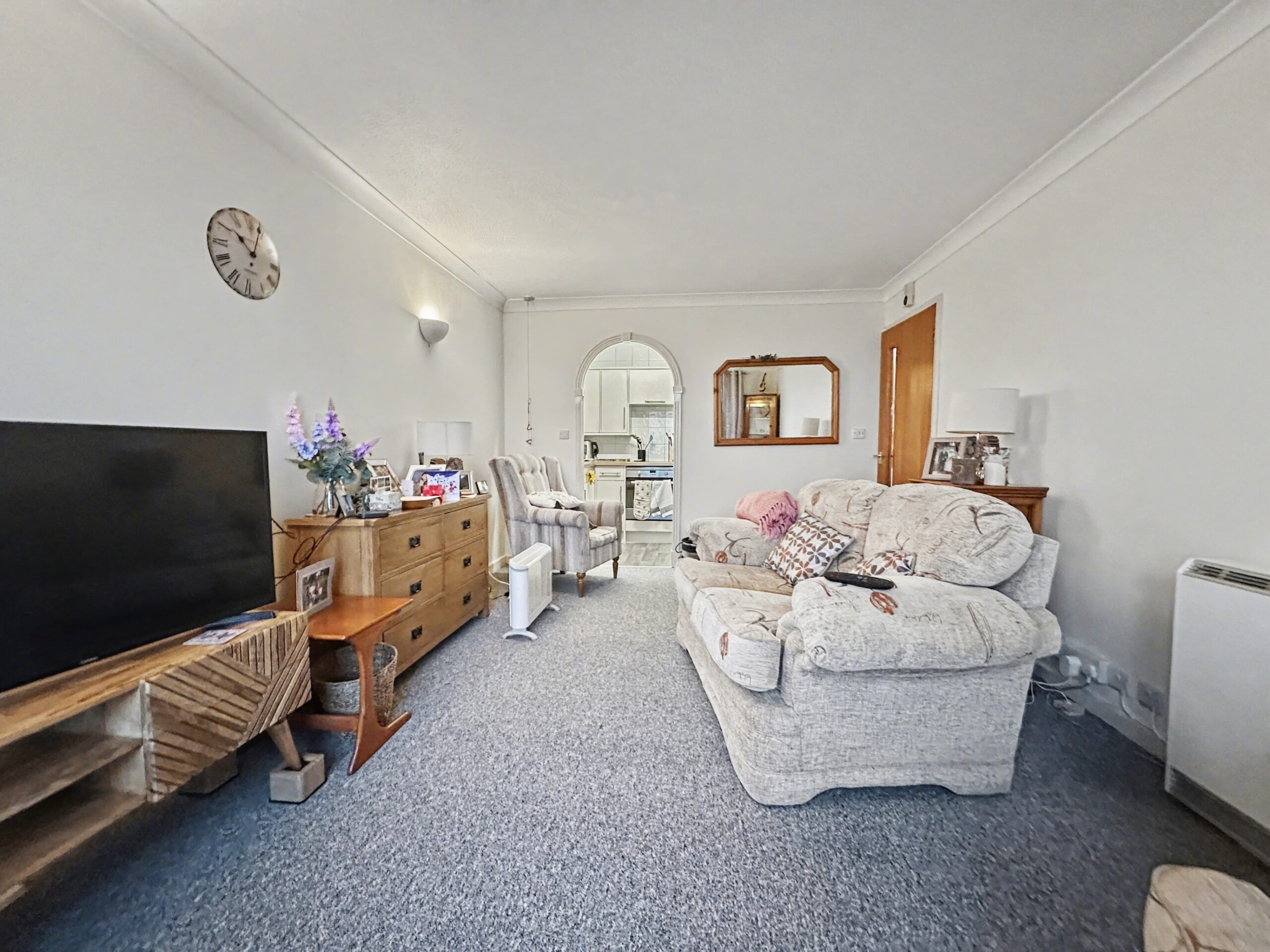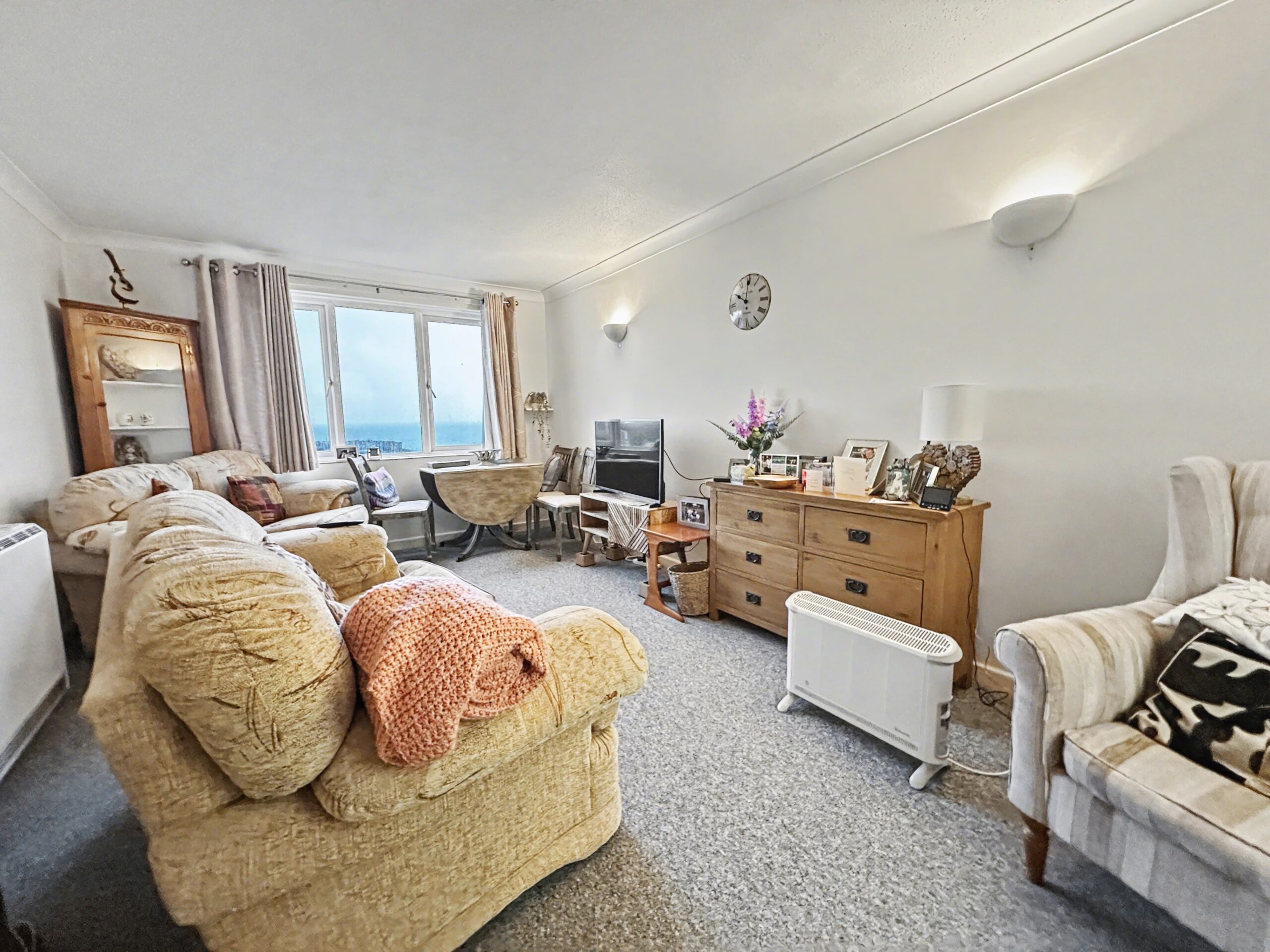 The flat itself is in excellent condition throughout and is thoughtfully designed to maximise comfort and natural light. The spacious lounge is south-facing, allowing for an abundance of sunlight and offering breathtaking sea views that can be enjoyed throughout the day, while the adjoining bedroom shares the same sunny aspect and a built in wardrobe. The modern fitted kitchen has base units on 3 walls with space for appliances and matching wall units. The contemporary shower room features stylish fixtures, a walk-in shower enclosure, and practical storage solutions.