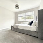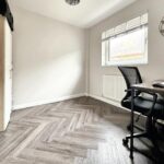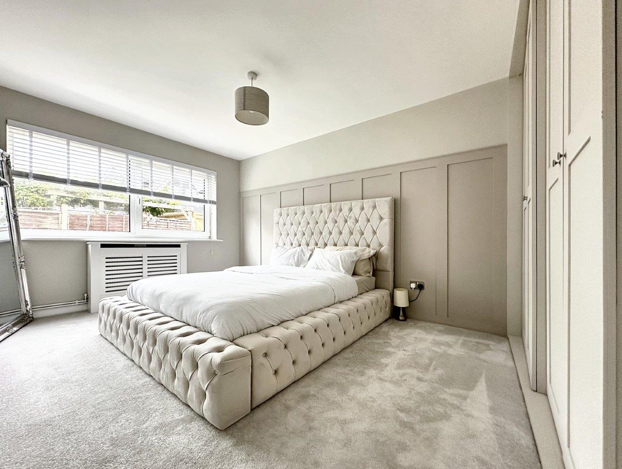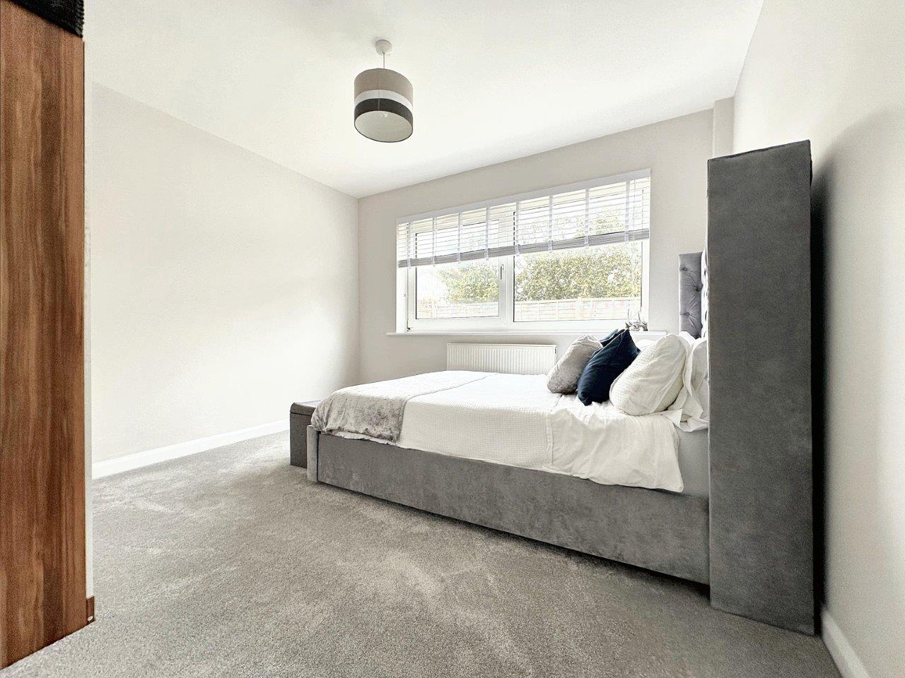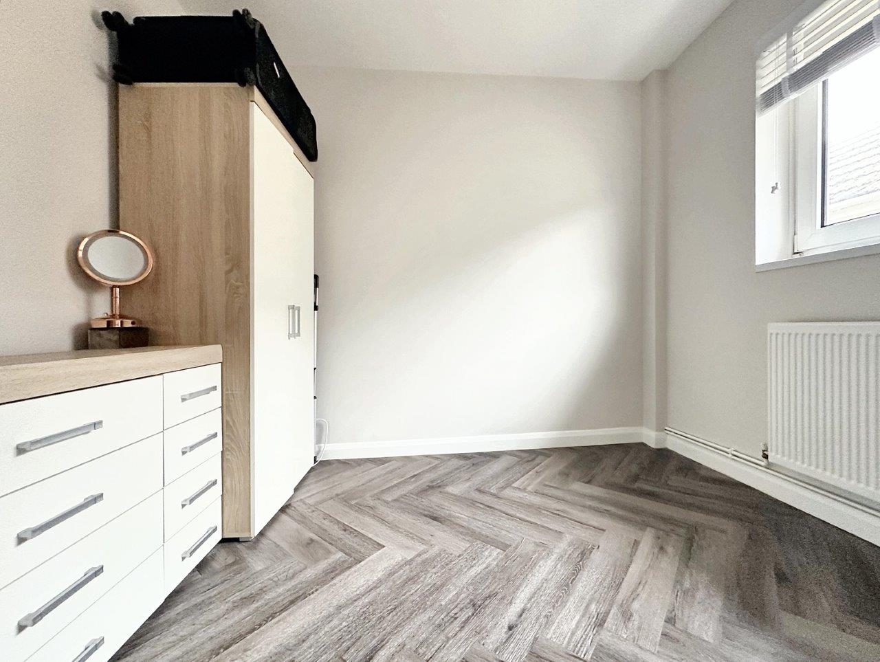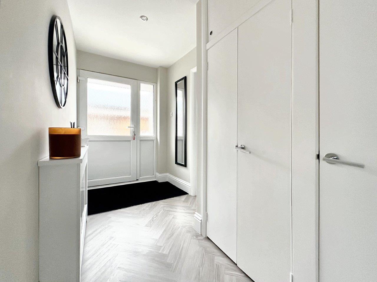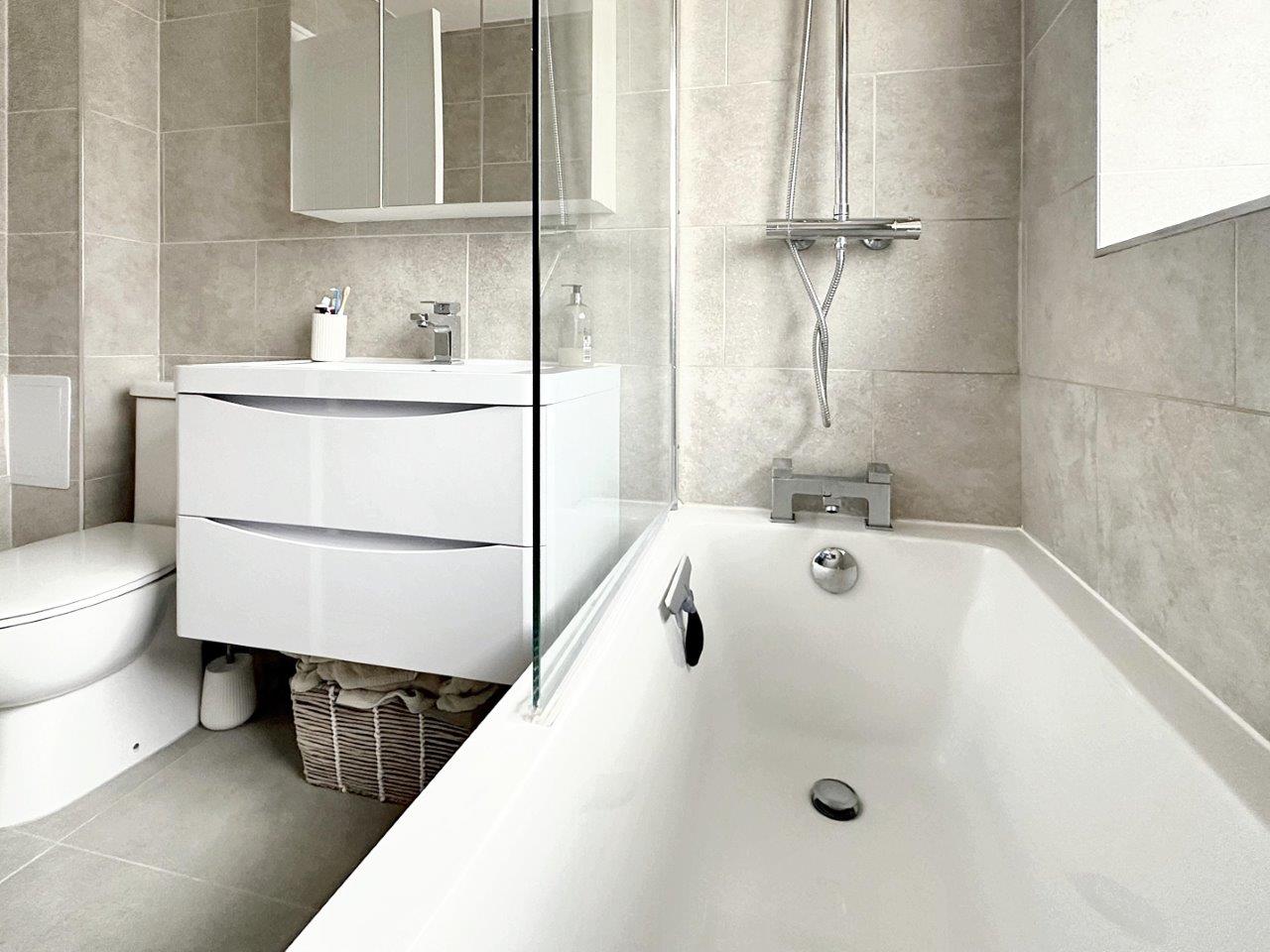 The 21' entrance hall is filled with light and has a door to the rear garden. The Lounge/Dining room is a lovely size and has large windows with fitted blinds overlooking the front garden. The flooring is a modern grey 'karndean' floor. The room leads seamlessly into a modern fitted kitchen with a range of grey 'Shaker' style units with Quartz worktops. A range of base cupboards, drawers and matching wall units offer generous storage space. There is an integrated gas hob with electric oven below and space for a fridge/freezer and a washing machine or dishwasher.