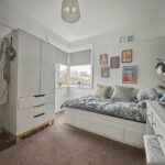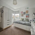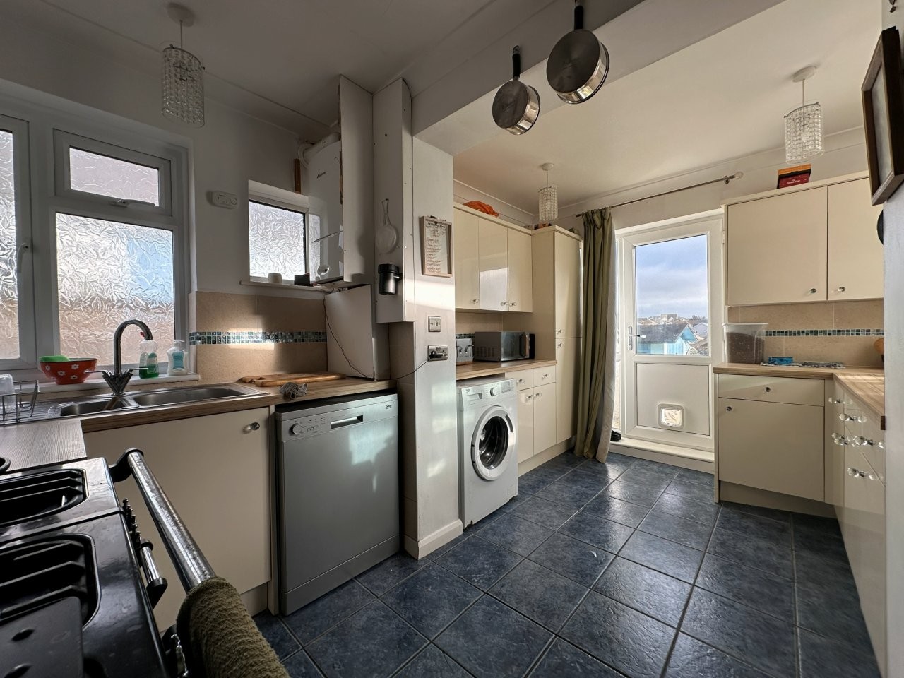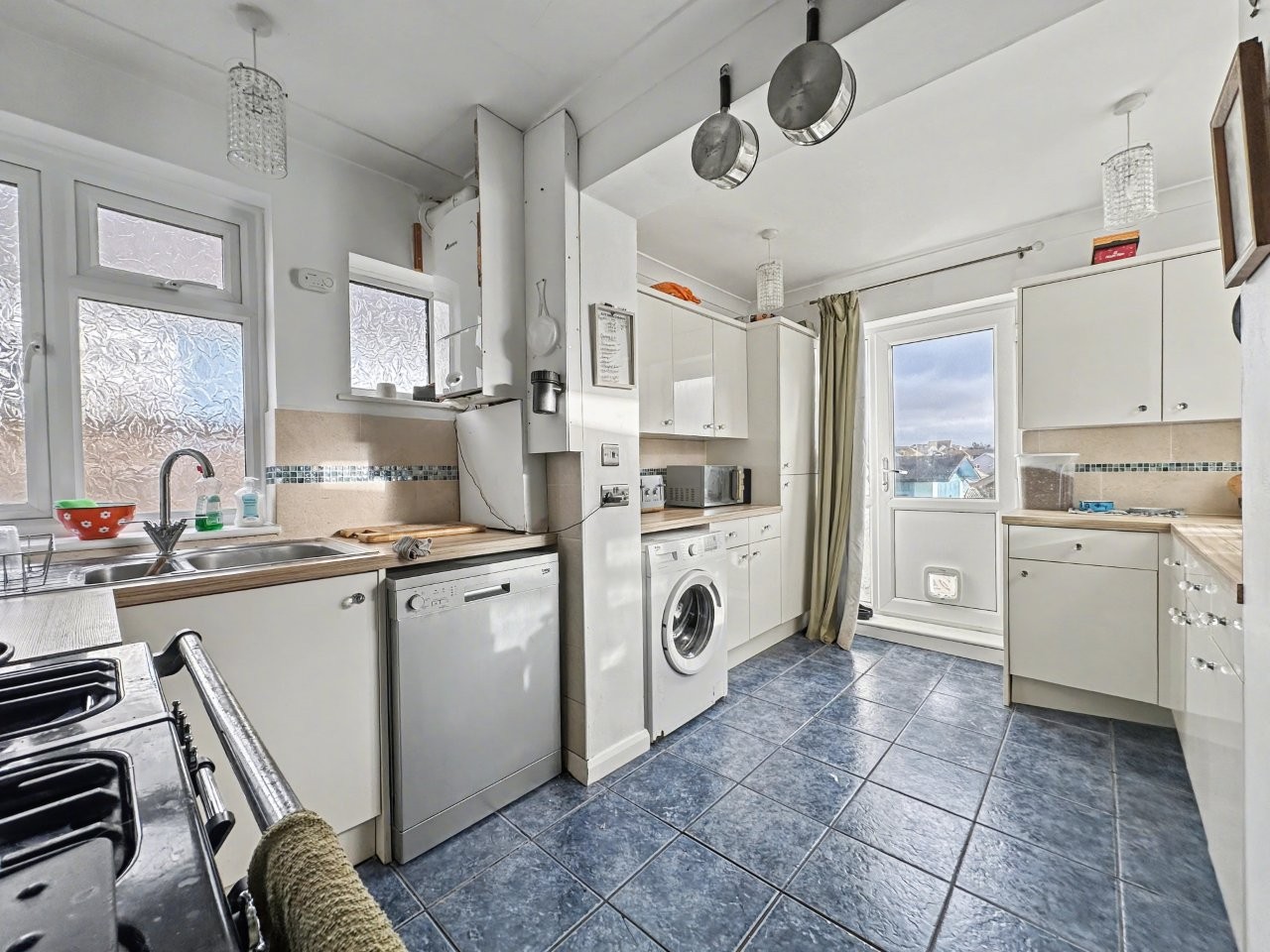 The kitchen is well-appointed and thoughtfully arranged, with direct access to the rear garden for effortless indoor-outdoor living. Finished in a modern cream colour, the kitchen has a range of base cupboards and drawers, matching wall units and space for all appliances. A range cooker is also included.