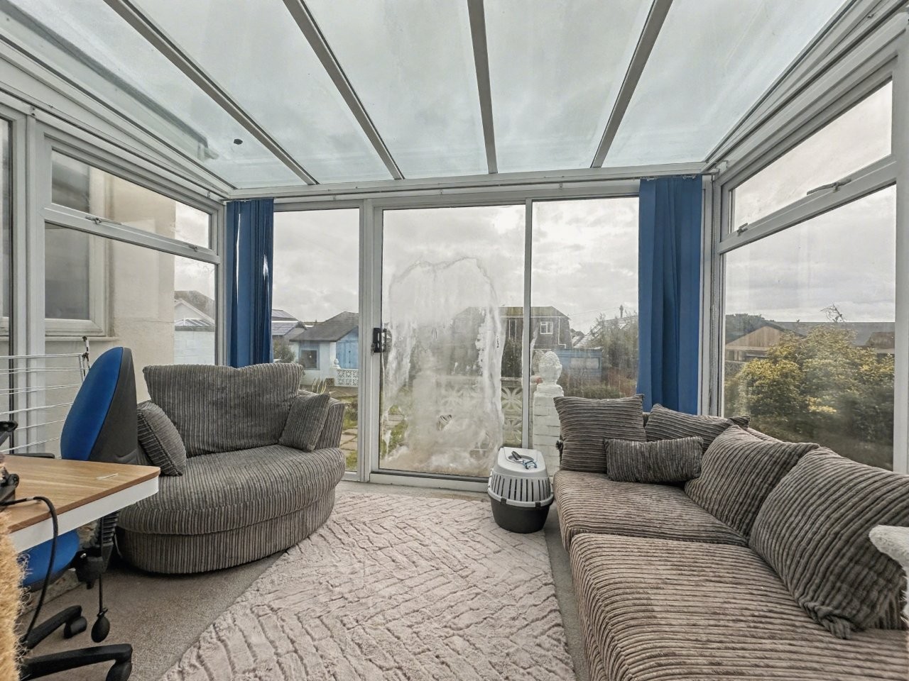 Upon entering the bungalow, you are greeted by a useful entrance porch which leads to the main hallway. A bright and spacious lounge features a wide bay window that provides captivating sea views, allowing natural light. The current owners have recently decorated the room and installed a modern fireplace.